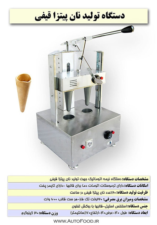 دستگاه تولید نان پیتزا قیفی مدل رومیزی دارای دو قالب جهت تولید نان پیتزا قیفی میباشد